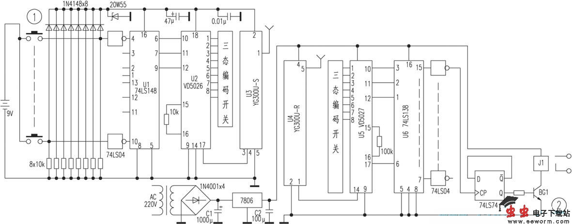 当无键按下时,U1、U2、U3无电源供电而不工作,因此不耗电。当有按键按下时,电源便经过二极管向三个集成块供电,同时输入的数据经74LS148编码后由它的、、脚向VD5026的、、脚输入数据,该BCD码经VD5026编码后,以串行编码脉冲方式通过脚输入到发射集成块YG300U-S的、脚,然后由脚向外发射。
