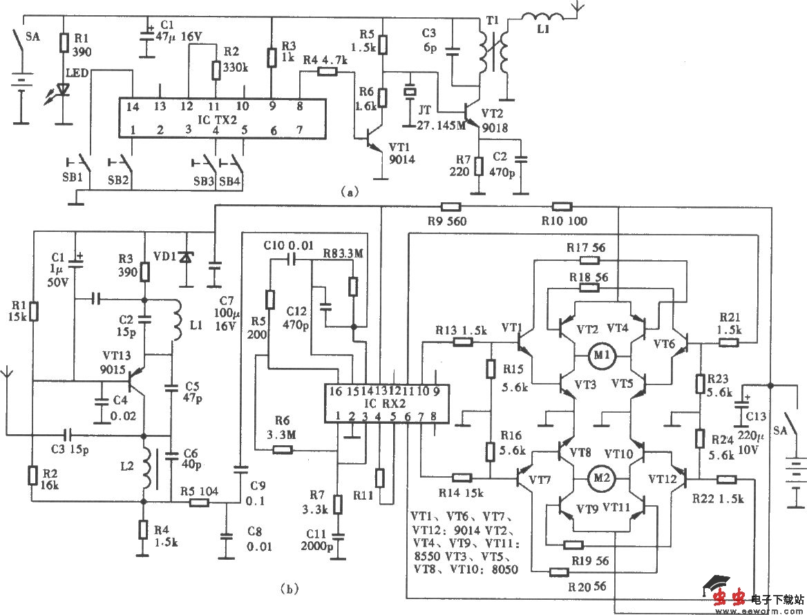 无线电遥控玩具车电路 (a)发射器电路;(b)接收器电路