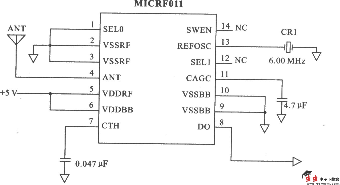 MICRF011是MICRF001的增强型接收器,适合在无键进入人系统、安全监控系统、遥控风扇、灯具控制和车库门开启等产品中应用。 主要技术特点如下: ·采用了Mierel公司最先进的QwikRadioTM技术, ·提供2种工作方式:超外差式(FIXED)和扫描方式(SWP); ·工作频率为300~440 MHz; ·OOK解调方式; ·接收灵敏度为一95 dBm(433.92 MHz); ·数据传输速率为2.5 Kb/s(SWP)或10 Kb/s(FIXED); ·工作电压为4.75~5.5 V; ·工作电流为2.4 mA(315 MHz),待机电流为0.9 μA; ·提供CMOS标准接口直接连接***和微处理器IC; ·在天线上的RF辐射非常小; ·不需要外部滤波器和电感,使得外围元件成本低; ·与MICRF001完全兼容。
