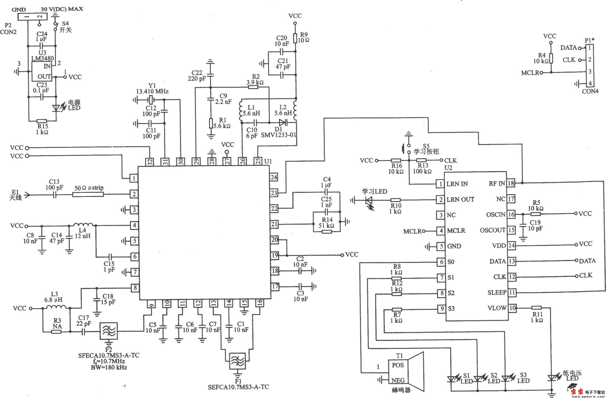 DKl002R是遥控无键进人系统的接收器模块,由RF2919接收器芯片和滚动码***芯片组成。DKl002R工作在868 MHz,天线印制在印制板上。与其配套使用的发射器模块是DKl002T。它适应在无键进入系统、无线安全系统、远距离监控和遥控中应用。 主要技术特点如下: ·工作频率为300~1000 MHz; ·滚动码编程; ·LED和蜂鸣器指示; ·接收灵敏度为-l00~-l04 dBm; ·电源电压为3.3~9.0 V; ·电流消耗(接收模式)为9~20 mA,低功耗模式电流消耗为1 μA。