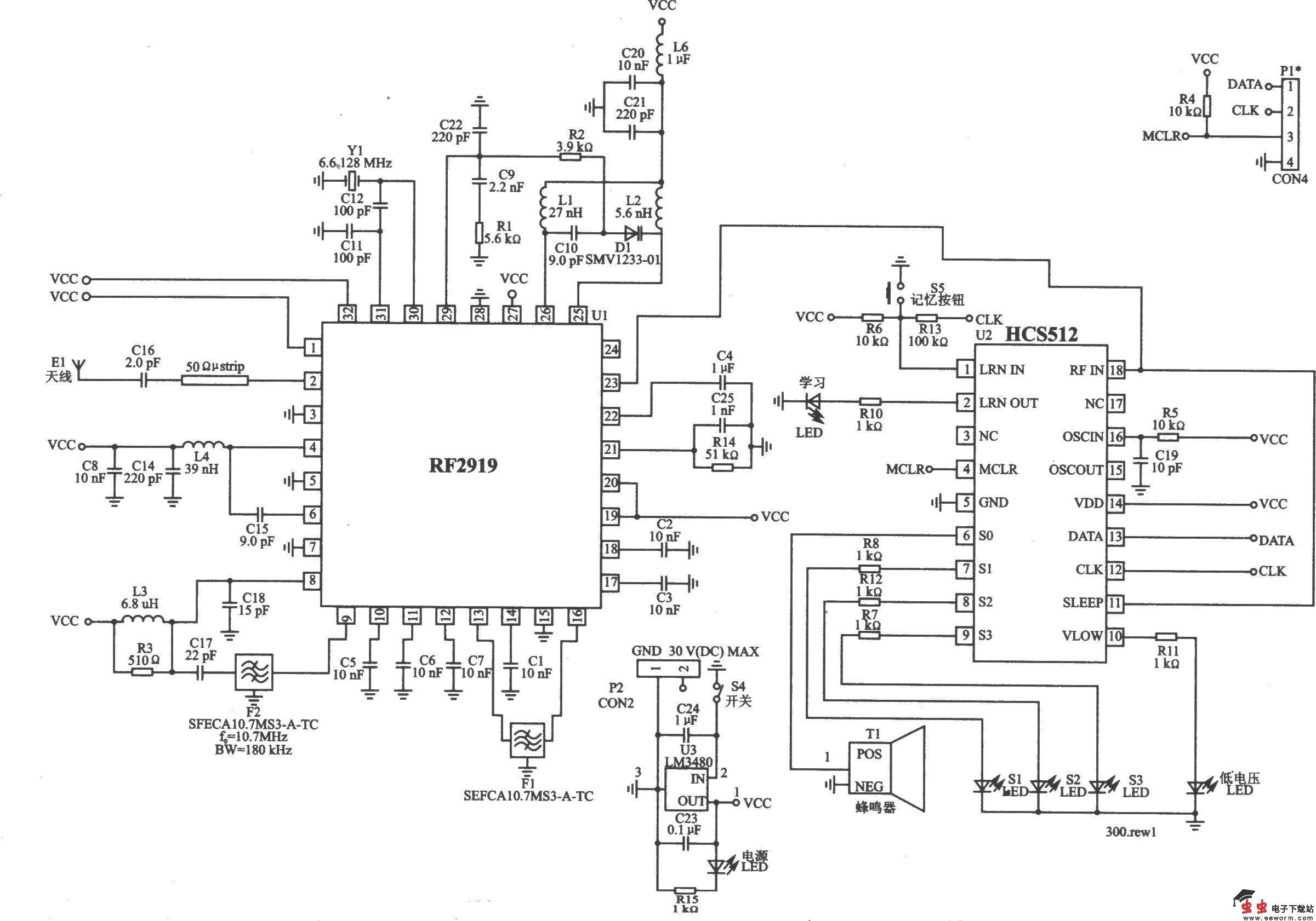 DKl001R是遥控无键进入系统的接收模块,由RF2919和滚动码***组成。与其配套使用的发射器模块是DKl001T。适合在无键进入系统、无线安全系统、远距离监控和遥控中应用。 主要技术特点如下: ·工作频率为433 MHz; ·滚动码***; ·LED和蜂鸣器指示器; ·输出功率为70 dBuV/m; ·电源电压为3.3~9.0 V; ·灵敏度为-l04 dBm; ·最大电流消耗(发射模式)为20 mA; ·天线印制在印制板上,电池在内部。