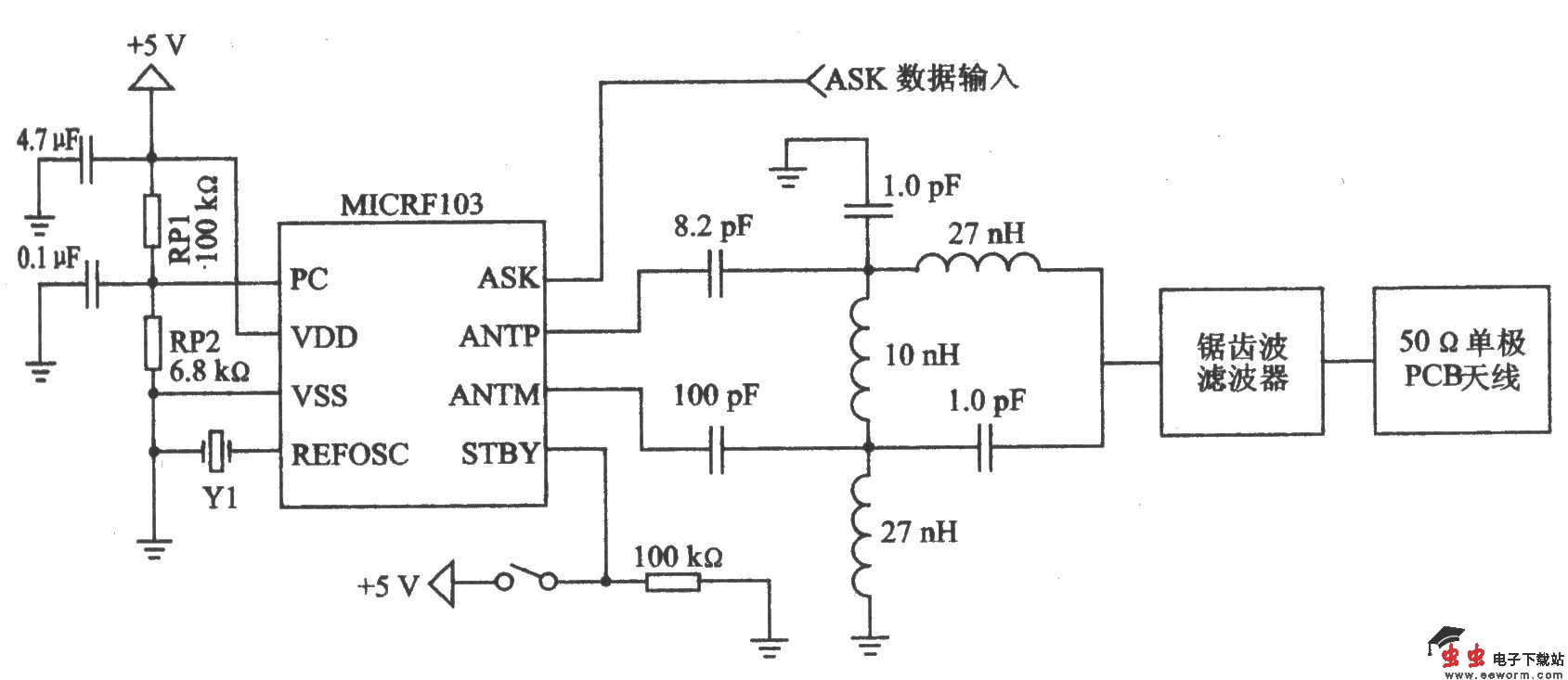 MICRFl03是使用Micrel’s QwikRadioTM技术的单片UHF发射器,是一个真正的“数据输入一无线输出”的单片器件。它可用于自动遥控无钥匙进入系统(RKE)、遥控系统、数据通信和安防系统中。 主要技术特点如下: ·工作频率为800 MHz~1 GHz; ·ASK/OOK调制方式; ·最大数据传输速率为ll5 Kb/s; ·提供低功耗模式; ·电源电压为4.5~5.5 V; ·最大输出功率为-3 dBm; ·工作电流为8 mA,待机电流为l.0 uA; ·天线自动调谐。
