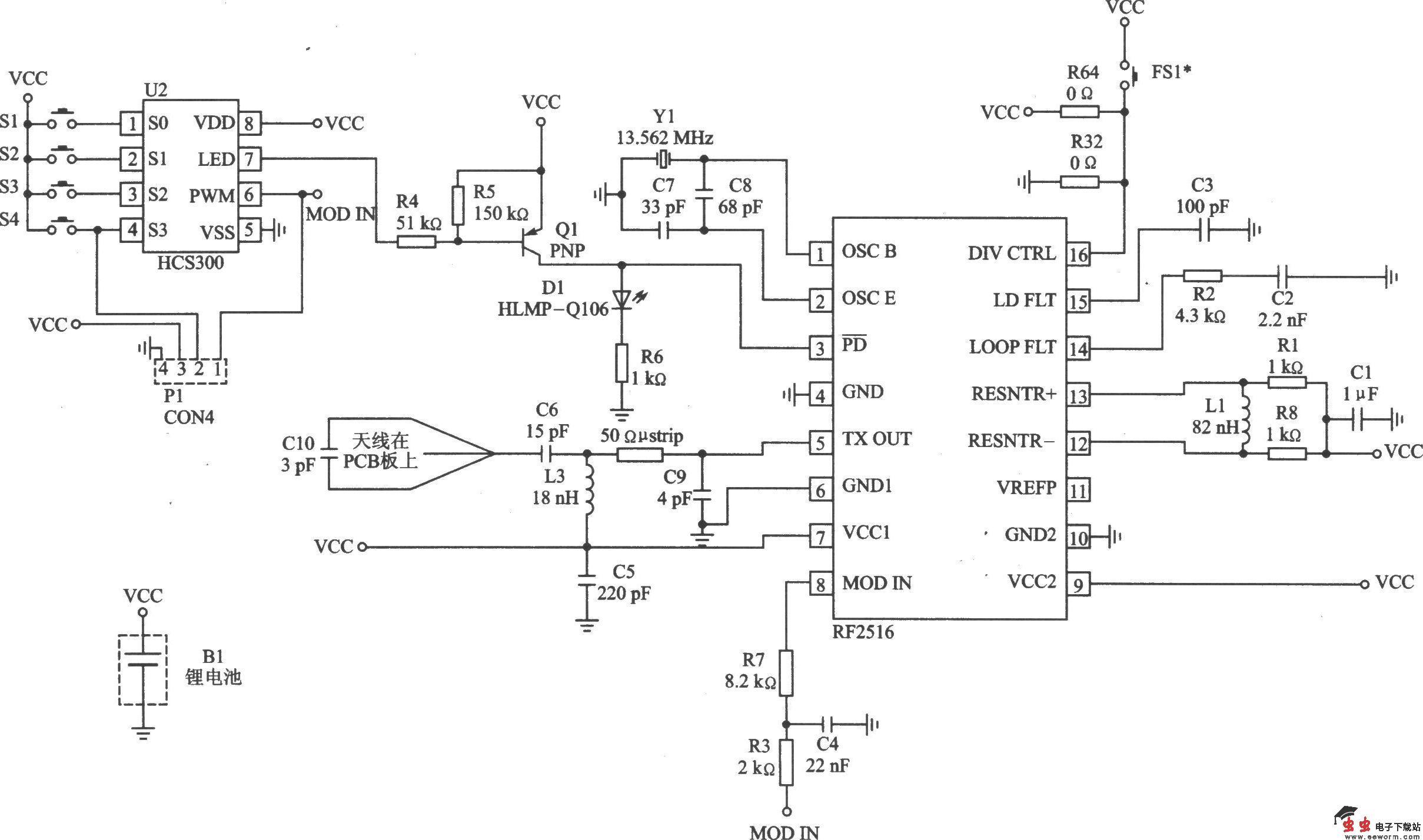 DKl001T是由RF2516和滚动码编码器组成的发射器模块。与其配套使用的接收器模块是DKl001R。它适合无键进入系统、无线安全系统、远距离监控和遥控中应用。 主要技术特点如下: ·工作频率为433 MHz; ·OOK调制方式; ·调制频率为l kHz; ·滚动码编程; ·输出功率为70 dBμV/m; ·电源电压为2~3 V; ·最大电流消耗(发射模式)为9 mA; ·天线印制在印制板上。