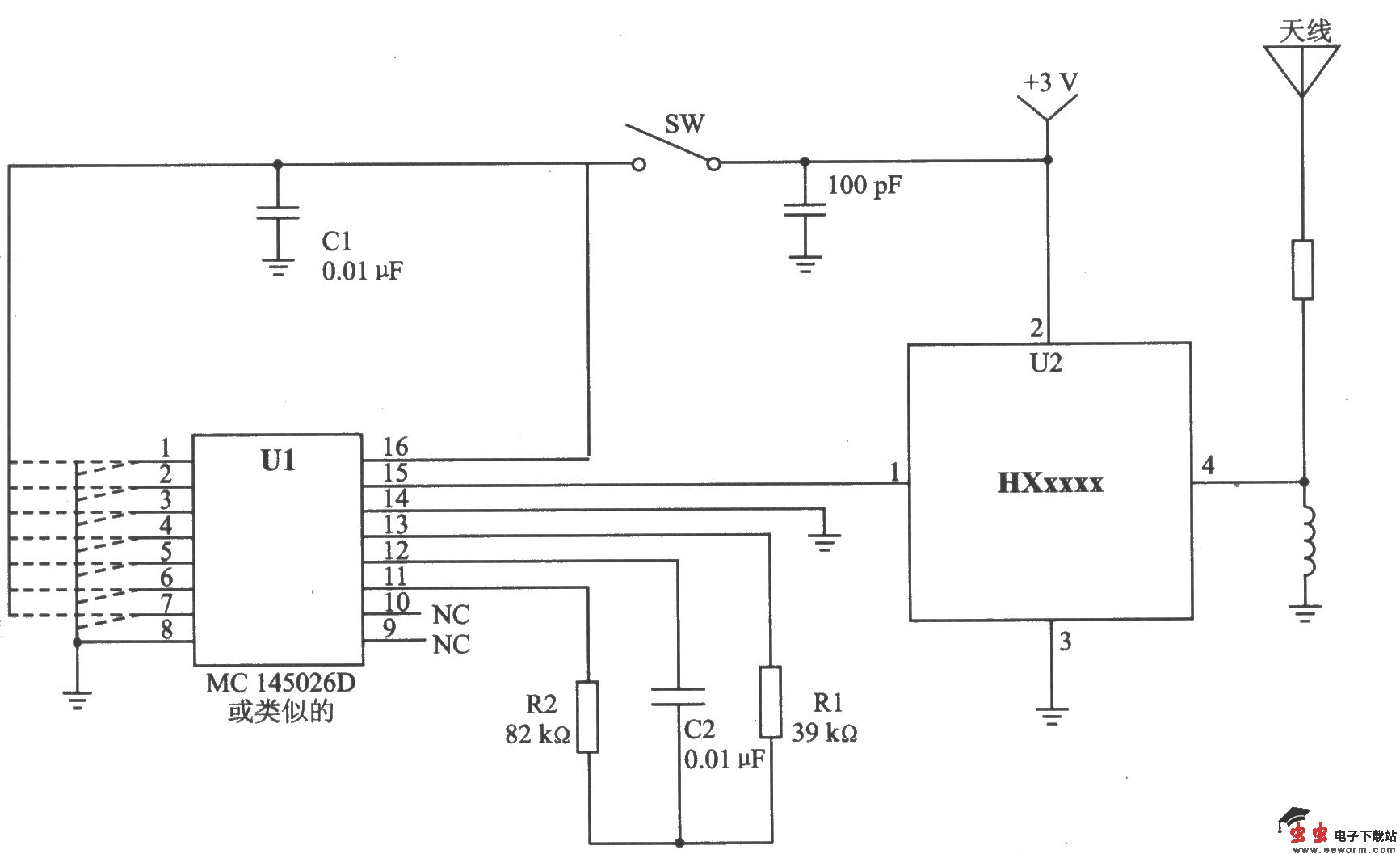 HXl000是微型发射器模块,是专门为欧洲ETSI I—ETS 300 220和德国FTZ l7 TR 2100标准的遥控器和无线安全数据传输操作而设计的。 主要技术特点如下: ·由外部数字编码器产生OOK调制; ·载波频率是由晶体振荡器产生,声表面波(SAW)稳定,输出的噪声由SAW滤波器抑制; ·工作频率为433.720~434.120 MHz; ·电源电压为2.7~3.3 V; ·工作电流为7~10 mA,待机电流为l.0 μA; ·RF输出功率为-5~0 dBm。