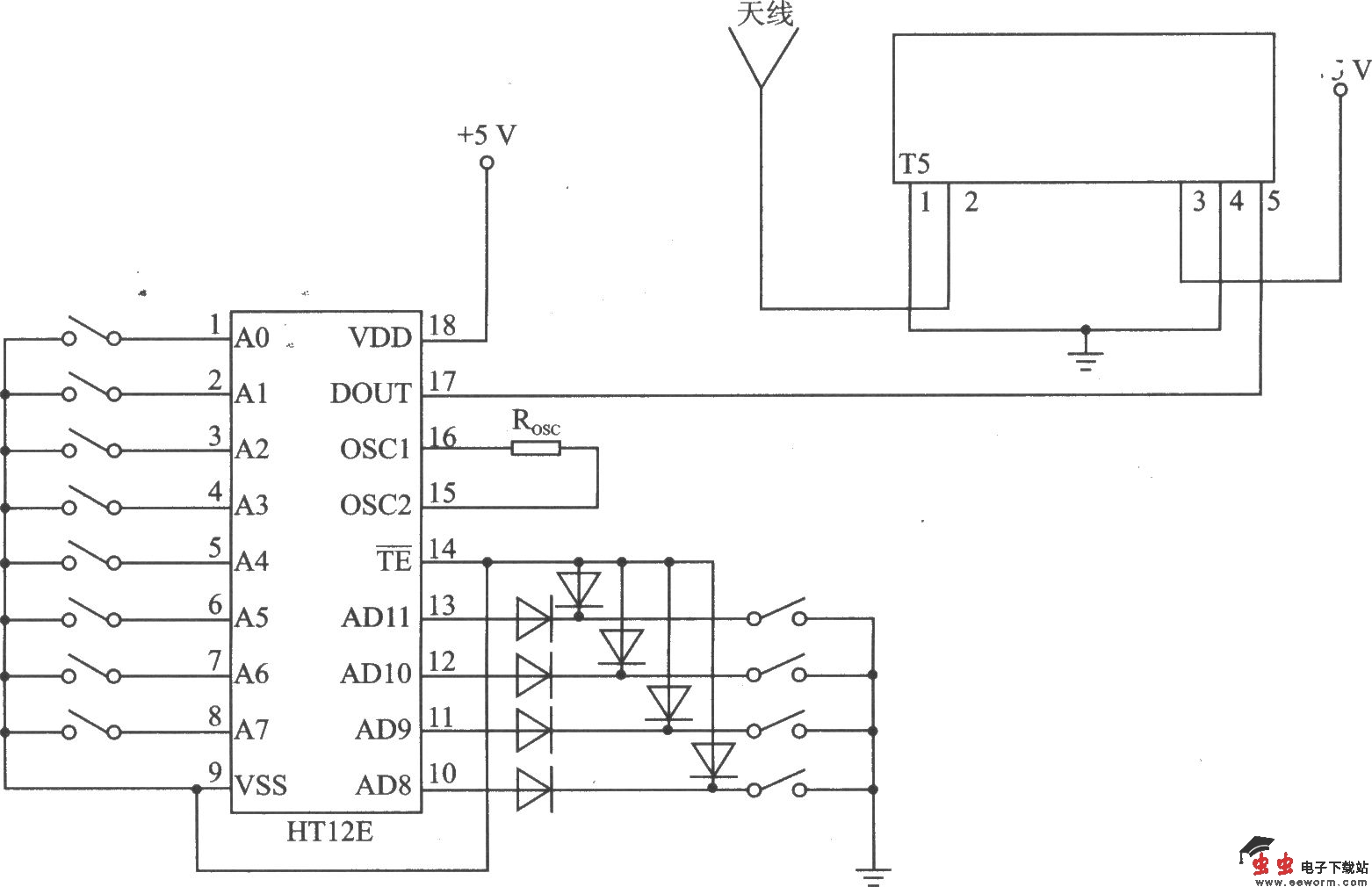 T5是一款微型的UHF发射器模块,与接收器模块R5配套使用,适合一对一或多点无线连接应用,如车辆的报警系统、库房大门的遥控开启以及家庭和商贸安防系统中应用。 主要技术特点如下: ·工作频率为433.92 MHz: ·数据传输速率可达到l28 Kb/s: ·发射距离可达到300 m; ·电源电压为4.5~5.5 V: ·最大工作电流为l2 mA: ·最大射频功率为 12 dBm.