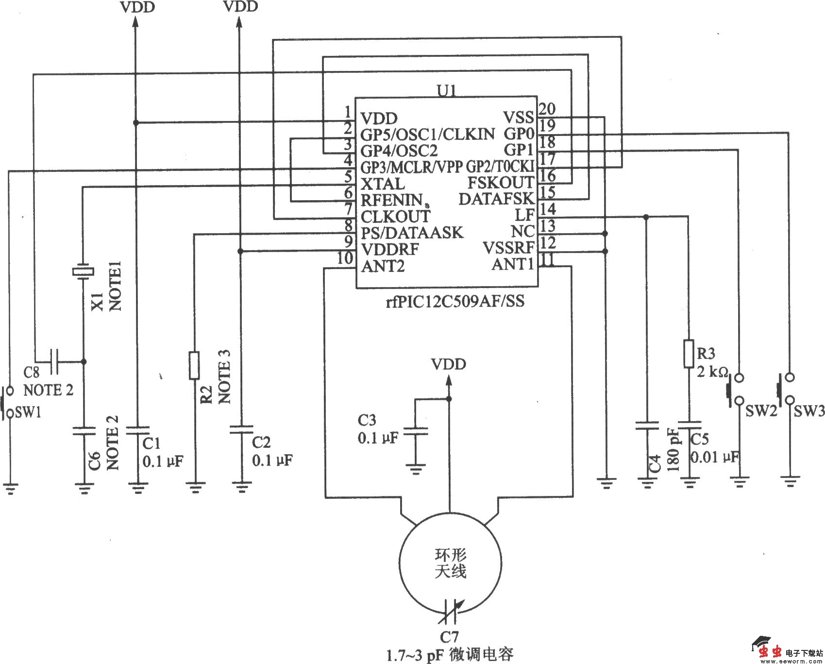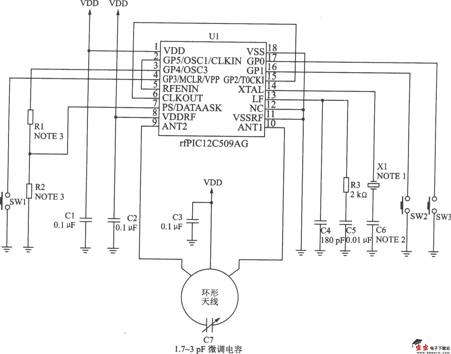 rfPICl2C509AG/509AF是内嵌8位CMOS微控制器的单片射频无线数据发射器,可用于遥控无键入口(RKE)发射器、车库门开门器、遥测(轮胎压力,水、电、气表,贵重物品跟踪)、无线安防系统和无线遥控等领域。 主要技术特点如下: ·芯片内嵌具有高性能的RISC中央处理器,33个12位字长的指令,8位字长的数据1024×12可编程EPROM,41字节数据RAM,8位可编程定时/计数器,上电复位,看门狗定时器,低功耗睡眠模式,可编程编码保护和5个通用I/O接口等功能; ·工作频率为310~480 MHz; ·rfPICl2C509AG调制方式为ASK,rfPICl2C509AF调制方式为ASK/FSK; ·ASK数据发射速率为0~40 Kb/s,FSK数据发射速率为0~20 Kb/s, ·工作电压2.5~5.5 V; ·输出功率 2~-l2 dBm,可调节; ·工作电流为-4.8~11.5 mA,低功耗睡眠模式电流为0.2~4μA。