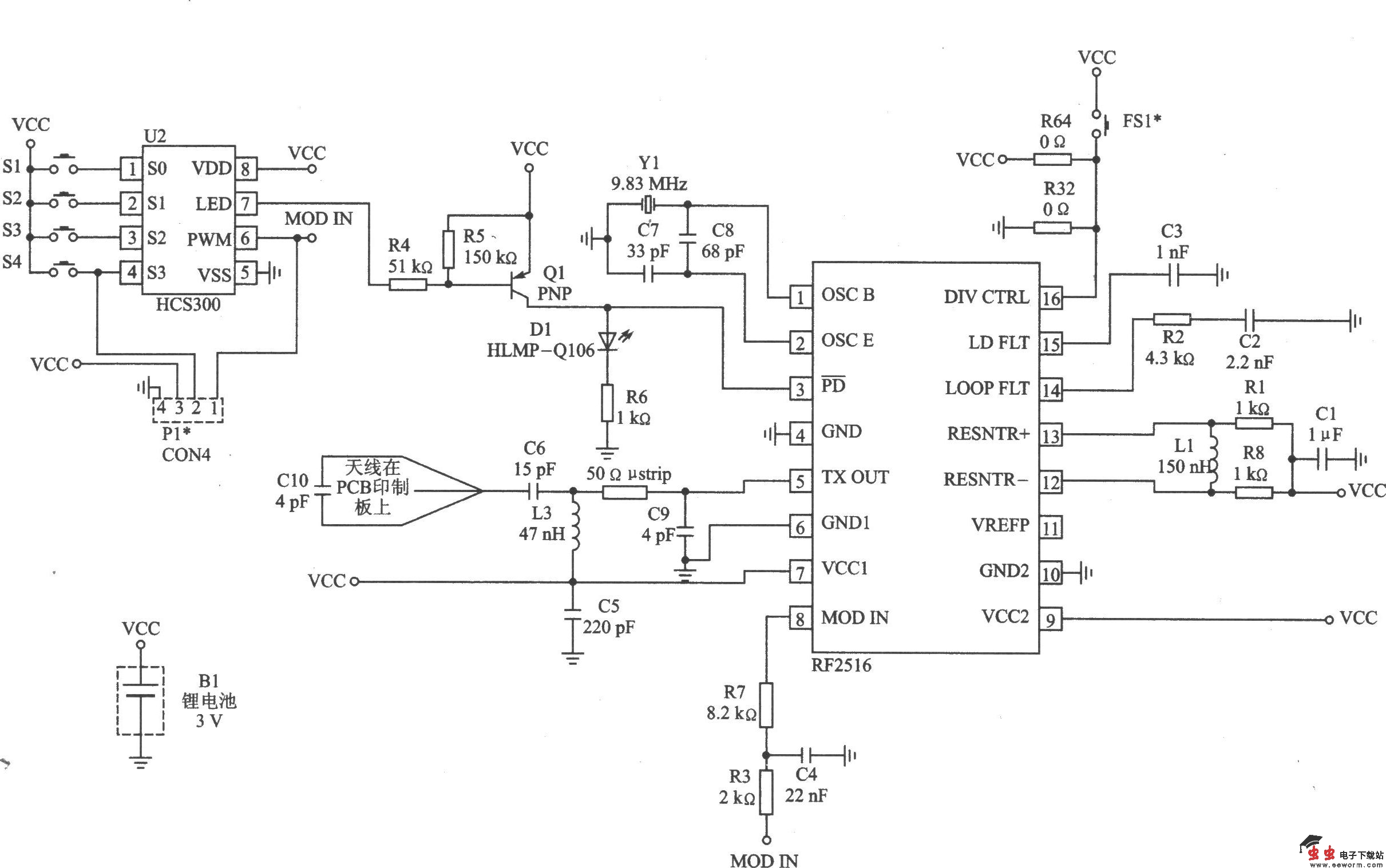 DKl000T是由RF2516和滚动码编码器组成的发射器模块。与其配套使用的接收器模块是DKl000R。DKl000T适合无键进入系统、无线安全系统、远距离监控和遥控中应用。 主要技术特点如下: ·工作频率为315 MHz; ·00K调制方式; ·滚动码编程; ·LED指示器; ·输出功率为70 dBμV/m 5 ·电源电压为2~3 V ·电流消耗为4~9 mA; ·天线印制在印制板上。