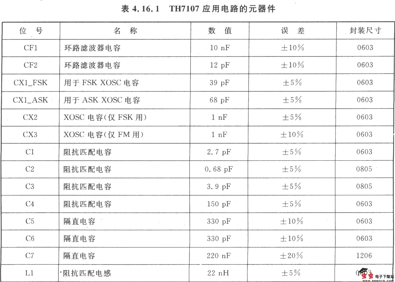 TH7107是一款单片发射器芯片,符合EN 300 220及类似标准,可用于无钥匙进入系统、遥控/遥测系统、数据通信系统和安防等系统中。 主要技术特点如下: ·工作在310~440 MHz频段; ·FSK/FM/ASK调制方式; ·FM利用外接的变容二极管; ·ASK数据传输速率为40 Kb/s,FSK数据传输速率为20 Kb/s; ·电源电压为2.2~5.5 V; ·工作电流为4.8~11.5 mA,最大待机电流为0.1 μA; ·输出功率为-12~ 2 dBm; ·可为微控制器提供基准时钟。