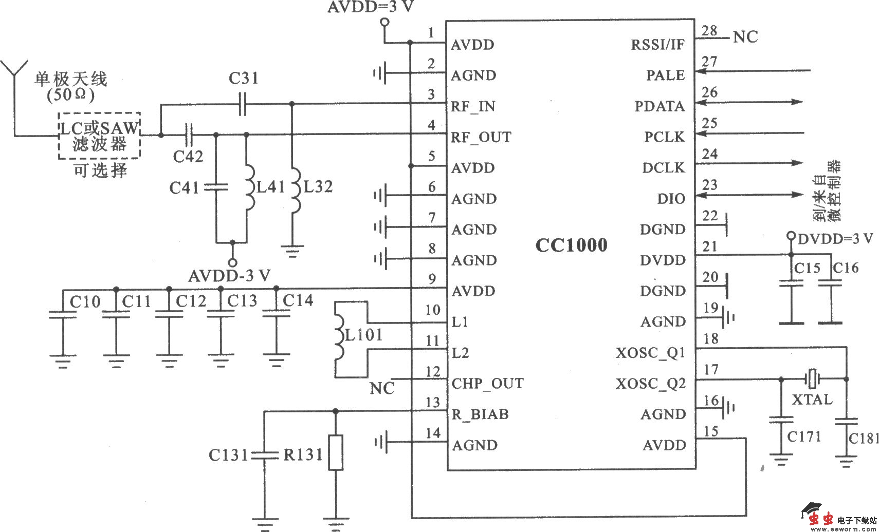 CCl000是可编程、半双工UHF收发器,适合在计算机遥测/遥控、安防、家庭自动化和汽车仪表数据读取等无线数据发射/接收系统中使用。 主要技术特点如下: ·工作频率为300~1000 MHz; ·FSK调制方式; ·数据传输速率可达19.2 Kb/s(曼彻斯***或NRZ码); ·接收灵敏度为-l09 dBm ·输出功率为-20~10 dBm(可编程); ·电源电压为2.7~3.3 V; ·电流消耗如果是接收模式为9.9 mA,如果是发射模式为27.8 mA,如果是低功耗模式为0.2μA(振荡器断开); ·芯片工作状态设置由芯片内控制器完成,控制命令和设置参数通过PCLK、PDATA和PALE 3线数字串行接口输入。