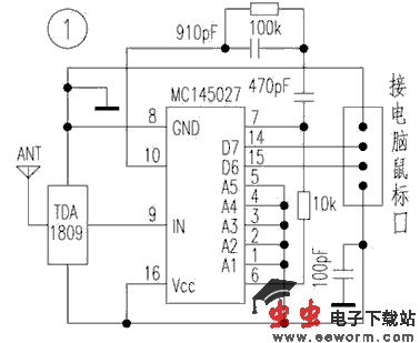射频发射模块TDA1809工作后,将接收到的编码信息输入MC145027译码电路,经其转换后在该芯片数据输出端D6和D7复原原鼠标数据线1和数据线2的信号,并通过原鼠标与电脑的连接线送入计算机。