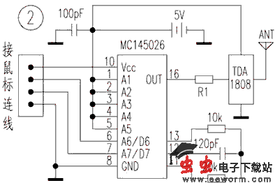 一般情况下,鼠标与电脑的连接线内部有4根电路连接线(该电路装置最多可以接受4条数据线输入,读者可根据自己鼠标的实际情况选择)分别是电源正极、电源地、数据线1、数据线2。我们将鼠标连线割断,分别找出这4根线,利用MC145026编码电路的数据传送端D6和D7接受鼠标数据线1和数据线2传来的数据,并在芯片内部编码后经射频发射模块TDA1808发射出去。