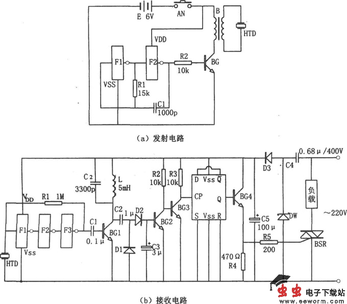 如图所示为超声波遥控开关电路。该电路由发射电路和接收开关电路组成。其中发射电路由多谐振荡器、功率放大器、升压变压器B、压电陶瓷片HTD和电源电路等组成,见图(a)。接收开关电路由压电陶瓷片HTD(与发射电路相同)、奇数级串联放大器、D触发器、谐振回路、直流电源电路等组成,见图(b)。
