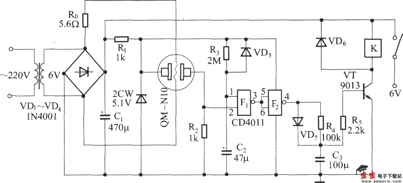 如图所示是由气敏传感器QQM-N10组成的煤气泄漏无线电遥控报警器,当煤气泄漏超过规定标准时,继电器K吸合,接通无线电发射电路的工作电源。本报警器的发射电路在图中未画出,它可采用任何一种无线电发射电路。