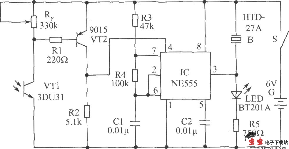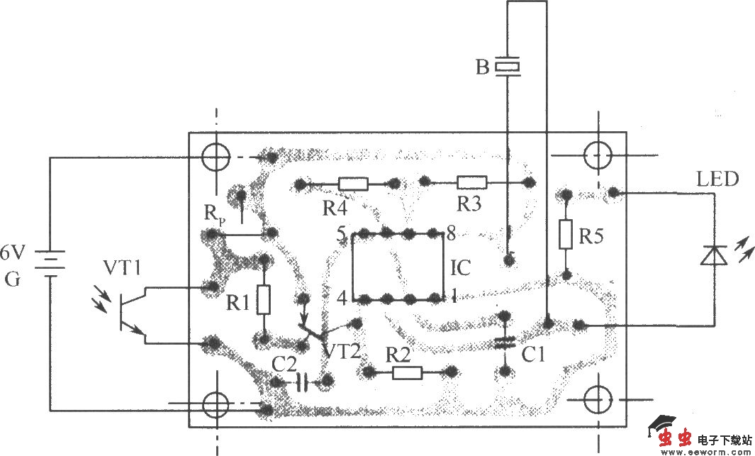 要快速判断遥控发射器的好坏,可使用如图所示的遥控检测器。如被检测的遥控发射器是好的话,它会即刻发出声光报警信号。该检测器可用于检测各种型号的彩电、录像机,组合音响、空调的遥控发射器好坏,使用起来非常方便。电路原理:如图所示是该检测器的电路原理图。由IC、R3和R4、C1组成一个音频振荡器,其振荡频率由公式f=1.443/(R3 2R4)C1进行估算。该电路音频设置在580Hz左右。 平时,光敏三极管VT1没有受到光的作用时,其内部电阻很大,使得VT2截止,且IC的复位端4脚为低电平而处于主复位状态,3脚为低电平,故使电路不发出声光信号。当按下被测红外线遥控发射器的任意一个遥控键时,其红外脉冲信号被VT1接收,使得VT1内部电阻很小,相应VT2导通,IC的4脚为高电平,这时IC处于音频振荡工作阶段,则3脚输出音频信号,故使压电陶瓷片B发出声音,且LED被点亮。元件器选:IC使用单时基555集成电路NE555,亦可用FX555、μA55、5G1555等型号。VT1为3DU31型光敏三极管。VT2选用放大倍数β>>100的硅PNP型晶体三极管9015。LED选用声Φ3mm的普通红色发光二极管,也可用声Φ5mm的发光二极管。电源G使用6V叠层电池,以缩小其体积。B选择压电陶瓷片HTD-27A。制作与调试:下图是该检测器的印制电路板装配图。光敏三极管VT1的受光部分不要露出机壳外,以距离机壳2mm--5mm为宜,并在VT1的受光孔处设置红色滤光塑料片,以免环境光线照射在VT1上,而造成误报。为提高B的发声响度,应给压电陶瓷片设置助音腔。调试时,先把RP调到最小阻值,再把遥控发射器对准红外接收管VT1,且按下遥控器某一个按键,然后调整RP的阻值,使其本检测器刚好发出声光信号即可。
