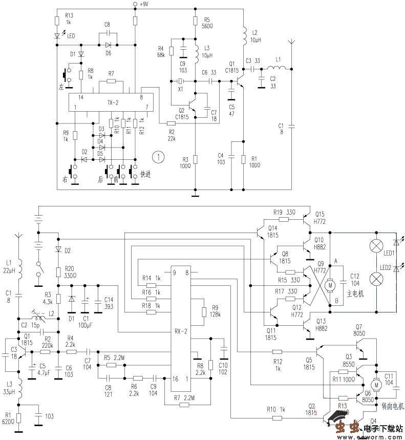 图2为接收机电路,在发射端发出的高频信号经接收天线接收,Q1、L2、C2、C3等构成的超再生接收电路,L2、C2为并联谐振回路,其作用是选频,C3为超再生正反馈电容,调整L2可改变接收频率。R1、R2、C5决定超再生的熄灭电压。接收信号经R4、C7送入译码电路RX-2的{14}脚进行放大,放大后的信号由{1}脚输出经R8送入译码信号输出端{3}脚进行译码。当译码电路将收到的信号译码后,若是前进信号,则{11}脚输出高电平,Q11导通→Q12、Q13分别导通,+4。5V等经Q12→MA→MB→Q13→地,电机正转,车子前进,其他功能依此类推,不再赘述。R9为振荡电阻。RX-2中的{6}、{7}、{10}、{11}、{12}脚分别为右转、左转、后退、前进、加速等功能的输出端。R20、D1、C1、C14组成简单的稳压电路,为RX-2提供稳定的工作电压,D2为隔离二极管。