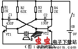 为发射电路。电路采用分立器件构成,VT1和VT2以及R1~ R4、C1、C2构成自激多谐振荡器,超声发射器件B被联接在VT1和VT2的集电极回路中,以推挽形式工作,回路时间常由R1、C1和R4、C2确定。超声发射器件B的共振频率使多谐振荡电路触发。因此,本电路可工作在最佳频率上。