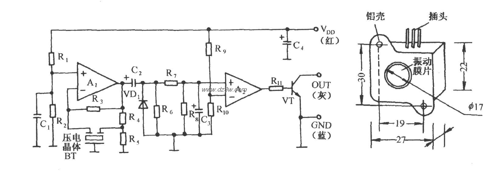压电式高料位自动控制及报叫电路 如图所示电路,它由压电式料位传感器、继电器控制机件电路、模拟发声电路和交流降压整流电路等组成。在料位升至设定的高料位位置时,电路能发出给定的模拟声,并同时切断送料设备的供电电源,使送料停止,确保运行安全。IC1是一种压电式料位传感集成电路,它由自激式振荡器、整流电路、电压比较电路和开路输出级等组成,下图所示为其内部电路: