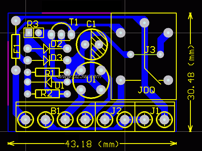 元件选择及制作注意事项:所有元件按照图中标明的参数选择使用,R3使用阻值为5K的正温度系数的热敏电阻,继电器使用5伏小型继电器,3V稳压管功率为0.5W,其他元件无特殊要求。安装:找个合适的盒子,把电路装起来,然后引出导线连接R3,将R3紧紧贴在热水器排气口的铁片上即可。调试:接通电源和接好排气扇,打开热水器,这时排气扇应工作,假如不工作,先查看R3是否很好铁在热水器的排气口上,再用万用表测量此时R3的阻值,适当减少R2使排气扇工作,电路就调试好了。下图为PCB图,大家有兴趣可以照着做一个。