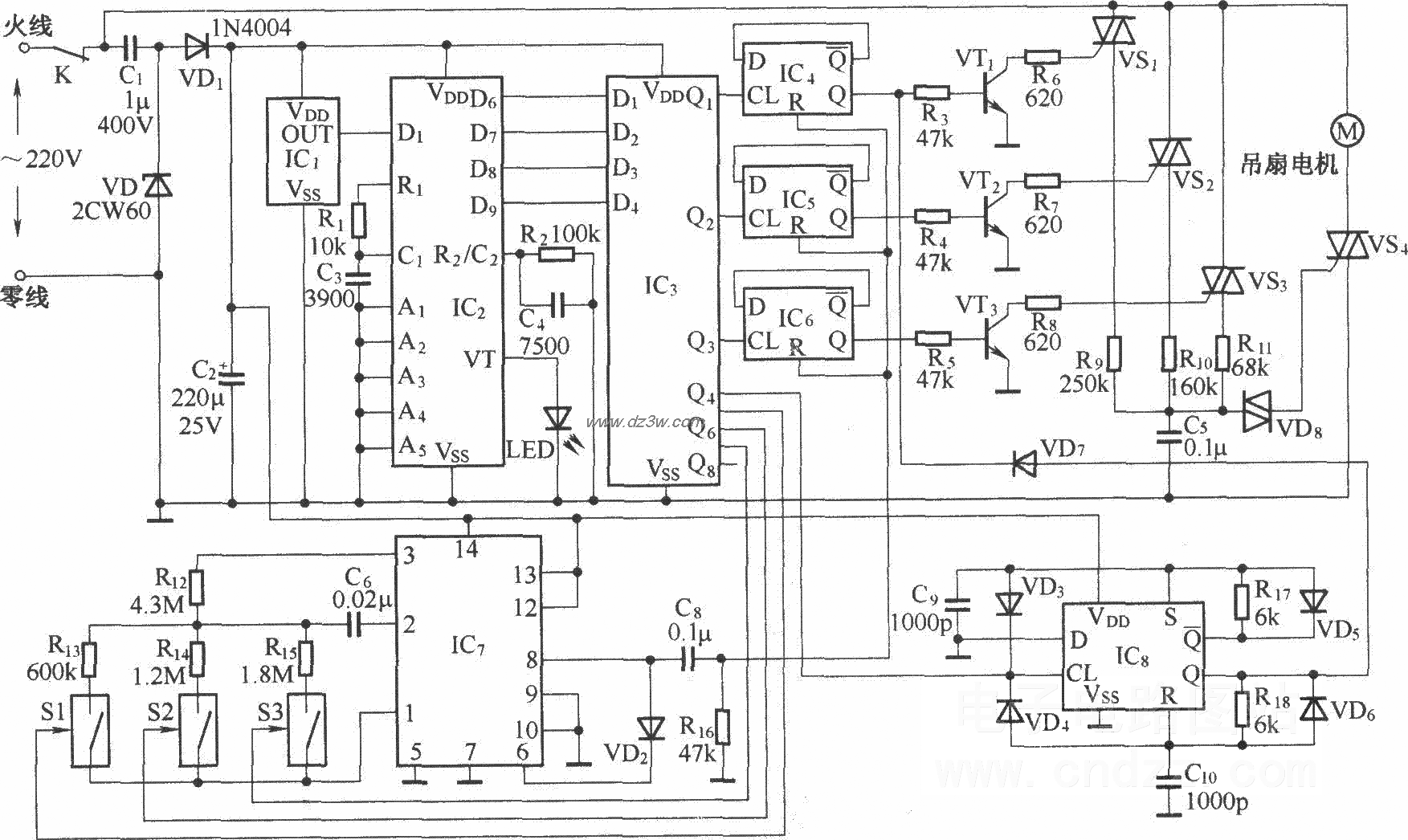 吊扇无线遥控接收电路: