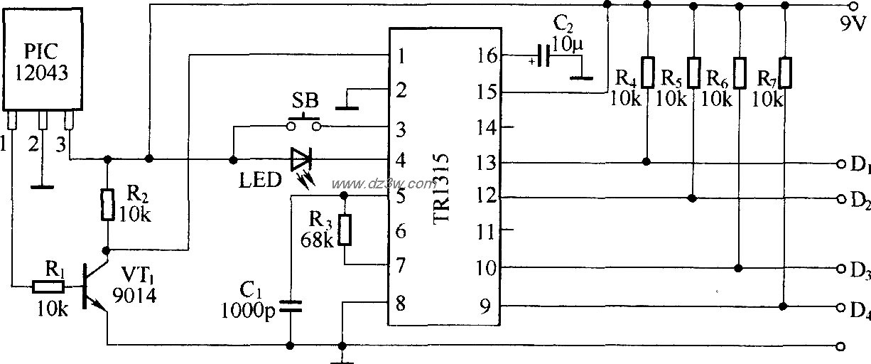 和数字编码电路一样,跳码编码电路所输出的编码也可通过红外线或无线电波进行传送。在接收端,通过接收、解调电路对所接收到的调制信号进行放大、解调后,由跳码解码芯片将通道数据解出后输出,通过控制执行电路去控制相应的电路。如图所示是由跳码芯片TR1300/1315与红外线遥控接收模块PIC12043组成的红外线遥控电路。遥控发射电路: