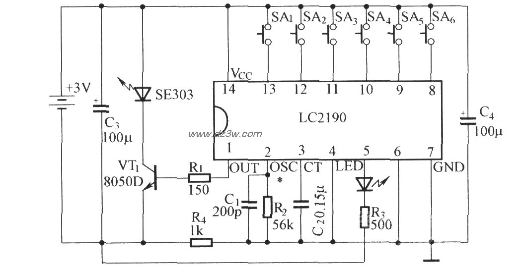 此电路由以下几部分组成(1)由CX20106和 LC2200组成红外接收与通道译码电路.(2)由可预置加减计数器电路,可控硅触发电路和计数译码显示电路组成(3)由可控硅触发管VT5与它的基极控制电阻网络R13~R16组成.当然,此电路的应用需要红外发射器,如下图所示