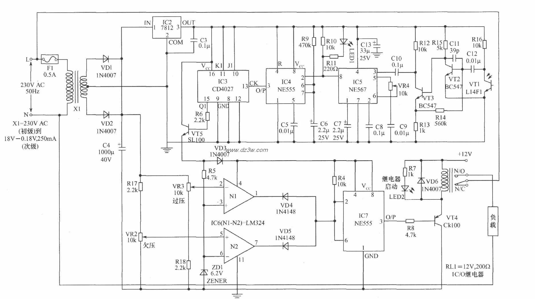 可负载保护器的主要功能有:(1)当电源电压过低或过高时自动切断负载电源;(2)当电源电压恢复正常时,自动接通负载电源;(3)提供电压正常指示,当电压过低或过高时指示灯熄灭;(4)使用遥控器远距离控制电源通、断。