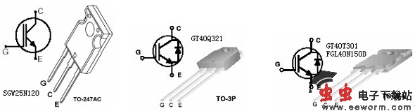 (4) GT40T101----东芝公司出品,耐压1500V,电流容量25℃时80A,100℃时40A,内部不带阻尼二极管,所以应用时须配套15A/1500V以上的快速恢复二极管(D11)使用,该IGBT配套6A/1200V以上的快速恢复二极管(D11)后可代用SGW25N120、SKW25N120、GT40Q321, 配套15A/1500V以上的快速恢复二极管(D11)后可代用GT40T301。