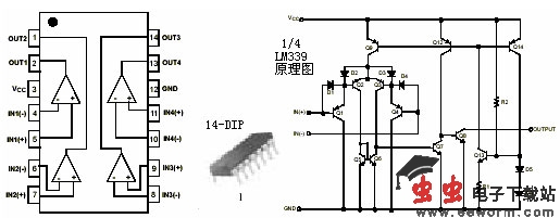 LM339内置四个翻转电压为6mV的电压比较器,当电压比较器输入端电压正向时(+输入端电压高于-入输端电压), 置于LM339内部控制输出端的三极管截止, 此时输出端相当于开路; 当电压比较器输入端电压反向时(-输入端电压高于+输入端电压), 置于LM339内部控制输出端的三极管导通, 将比较器外部接入输出端的电压拉低,此时输出端为0V。