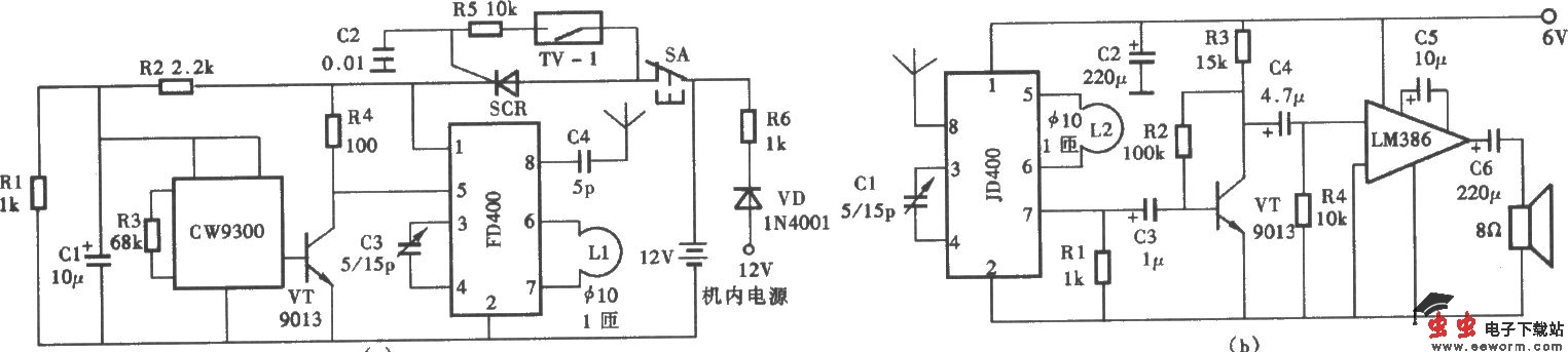 贵重家电防盗报警器电路 (a)发射器电路:(b)接收报警电路