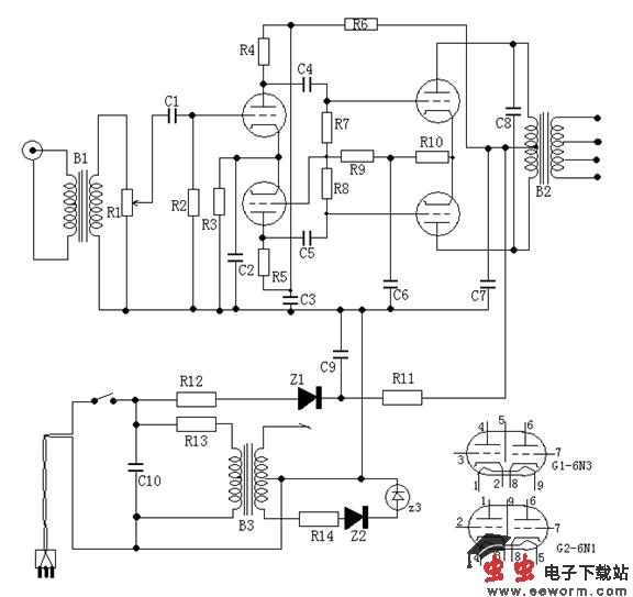 倒相采用自动平衡式,不需要调整。输出管6N1阴极电阻上并联的电容,对高低音特性有影响,可根据音箱特性调整。