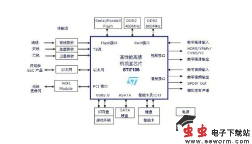 目前ST已经开发出了4代高清解码芯片,在高清数字电视单片解码SoC领域积累了丰富的经验,包括灵活的芯片技术架构设计,支持客户进行各种应用的开发,成熟的低成本的先进生产工艺等。其中STi7105 是一款高性能H.264高清数字电视机顶盒SoC解码芯片,采用先进的半导体生产工艺和优化设计来完善,提升各个功能模块的性能,增加高速数据接口,降低耗电量,降低系统的整体材料成本。STi7105是一款应用范围很广的SoC芯片,主要用于有线高清数字电视机顶盒,卫星高清数字电视机顶盒,地面数字电视机顶盒,IPTV机顶盒,网络电视下载播放,多媒体手持设备,家用多媒体中心等等。