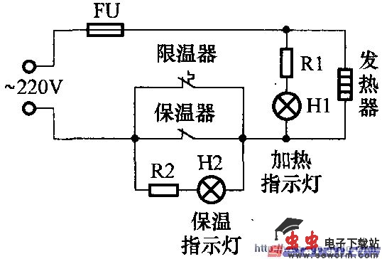 由热熔断器 FU、发热器、限温器、保温器、加热指示灯和保温指示灯等部分组成。接通