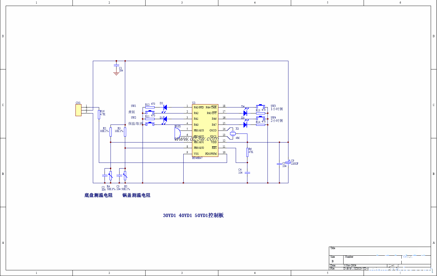 圆型电脑自动电饭煲电路(1) 圆型电脑电饭煲,底部加热、双传感器,LED指示,煮饭,1小时粥,2小时粥,保温,HT46R47