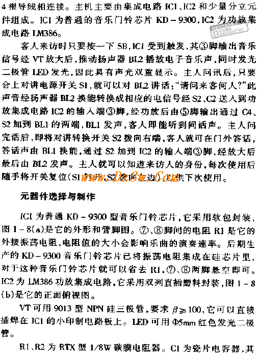 对讲音乐门铃电路图 对讲音乐门铃适用于门庭较深的住宅,它除了具有普通音乐门铃功能外,主人还可以和室外客人进行交谈,确定客人身份后再开门迎客,因此比较安全。 工作原理 对讲音乐门铃的电路见图 l 一 7 ,它由主机和分机两部分组成。