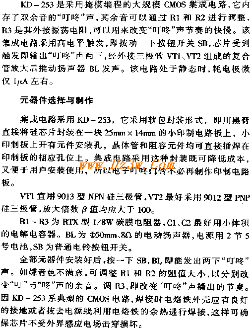 电子叮咚门铃电路如图 l 一 4 所示。它主要采用一块高音质“叮咚’”电子芯片 KD 一 253 制作而成。