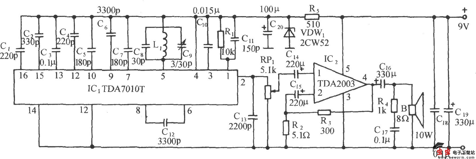 该电路是与牲畜护栏断线报叫无线发射机电路配套用的接收机,将它置于值班房内或由监听人员携带在身旁,一旦护栏断线,就会收到发来的调频(88~108MHz)信号,接收机扬声器就发出动物的相应叫声,以便采取措施。电路如图所示。FM接收机是一片调频(FM)专用集成电路TDA7010T为核心组成的。它的接收范围为88~108MHz,与发信的频率相对应。L1,C8,C9组成的并联谐振回路用于调准或跟踪发信频率,通过调节半可变瓷介电容器C9进行选频。一般情况下,只要元器件质量完好,调试将十分顺利。TDA7010T的不失真功率约为0.5W。为了得到较强的视听功率,加了一级音频功率放大电路,它是以***率的TDA2003集成电路为核心组成的。该电路的输入、输出阻抗匹配良好,不失真的输出功率可达6W。音量可通过接在放大器输入端的电位器RP1来调节。扬声器B的功率应不小于10W。