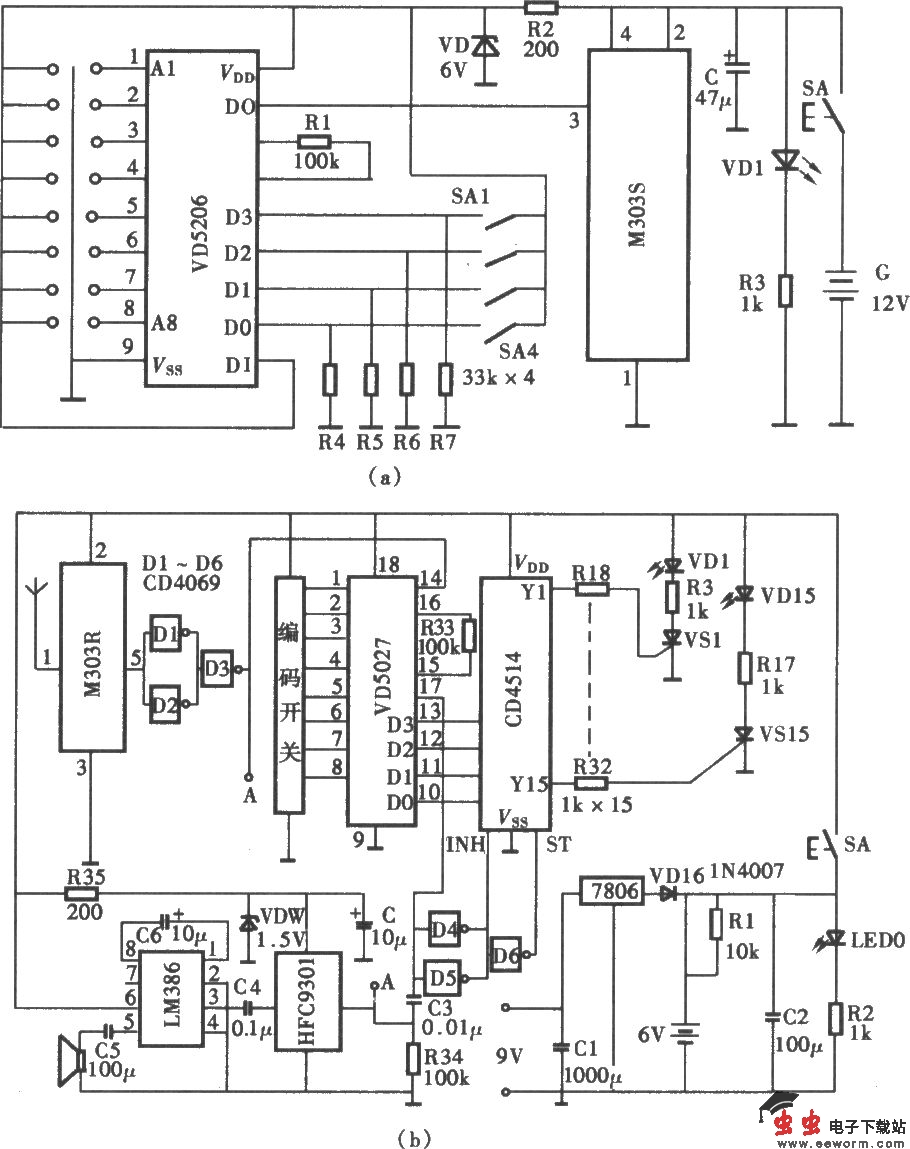 病房无线呼叫系统电路 (a)发射器电路;(b)接收显示器电路