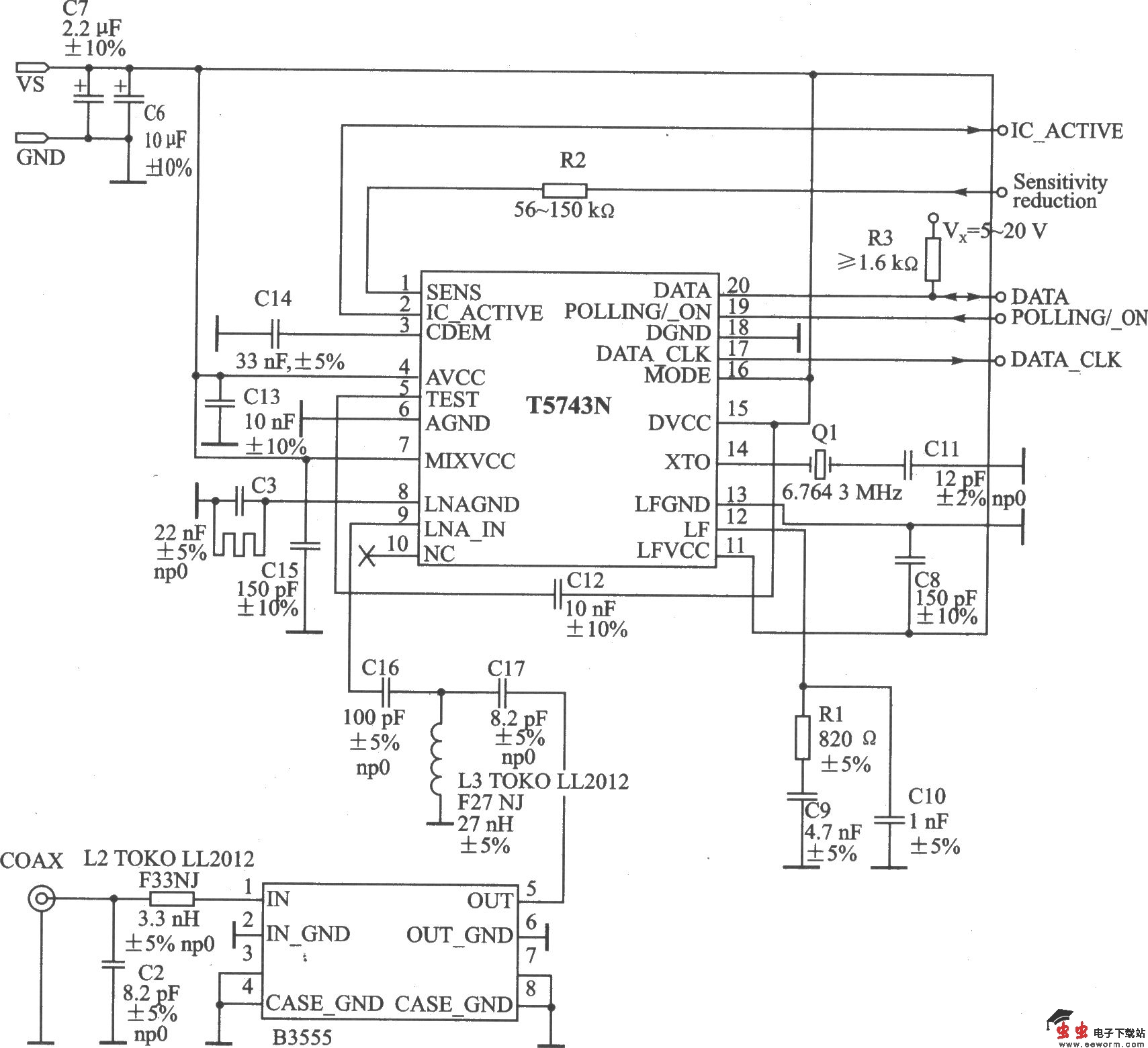 T5743N工作在433 MHz不用SAW滤波器的应用电路