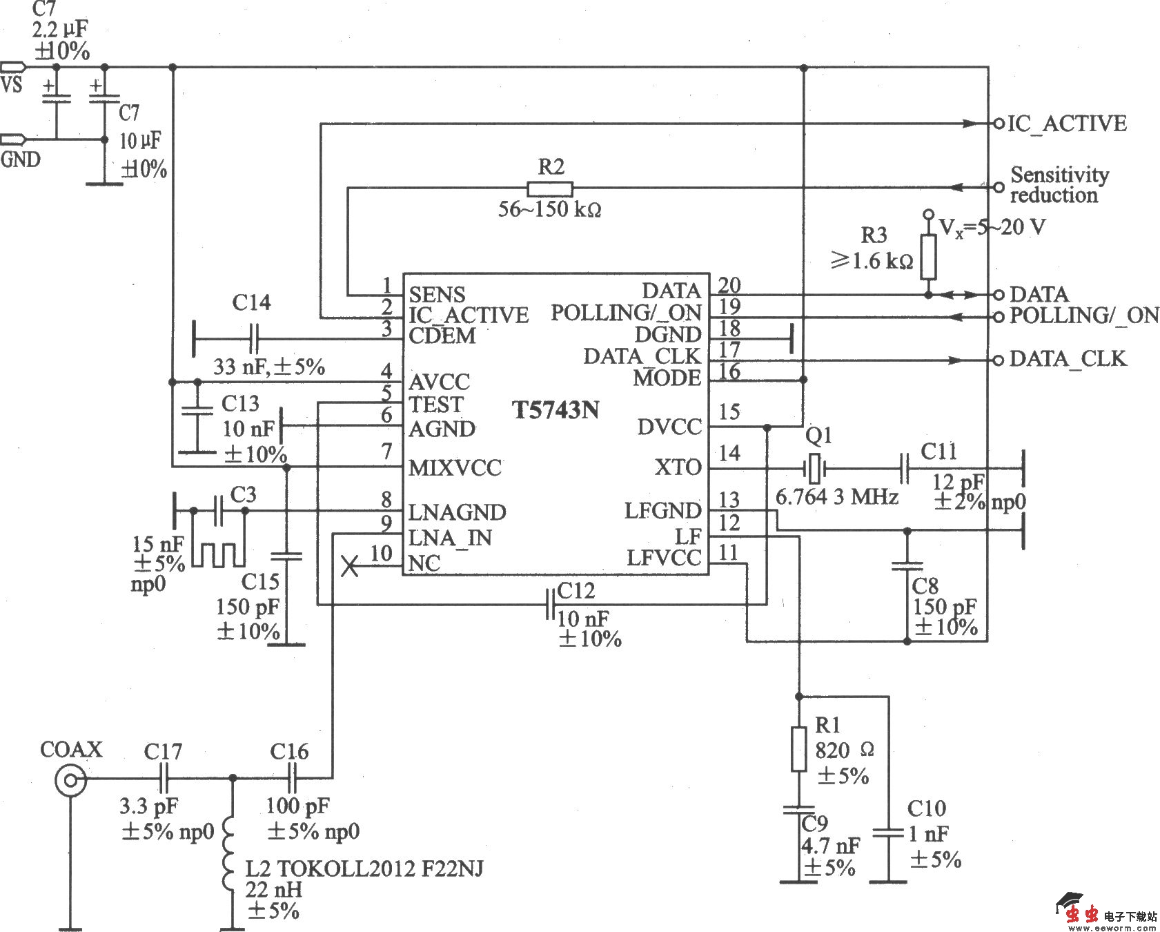T5743N是一款单片PLL接收机器件。它是为满足低数据率、低成本RF数据传输系统要求而开发出来的。T5743与U27418发射器匹配使用,主要应用在无线电遥测、保安技术和无键输入系统等领域。 主要技术特点如下: ·数据传输速率为l~10 Kb/s; ·编码方式为曼切斯特或双相位方式; 、 ·工作频率为300~450 MHz; ·ASK/FSK调制/解调方式; ·有信号强度指示,工作和睡眠模式选择; ·除天线适配电路外,只需很少外围电路,PCB板上没有其他RF元件; ·完全集成VC0; ·有可编程时间检测方式的自查询功能,实现低功耗功能; ·单端RF输入,容易与λ/4天线或PCB板的印制天线相适配; ·电源电压为4.5~5.5 V; ·符合美军标MIL-STD883 ESD保护(4KV HBM); ·能用简单的双向数据线实现与微控制器pC的通信; ·利用单独引脚经微控制器弘C可以实现电源管理; ·工作温度为-40~105℃。