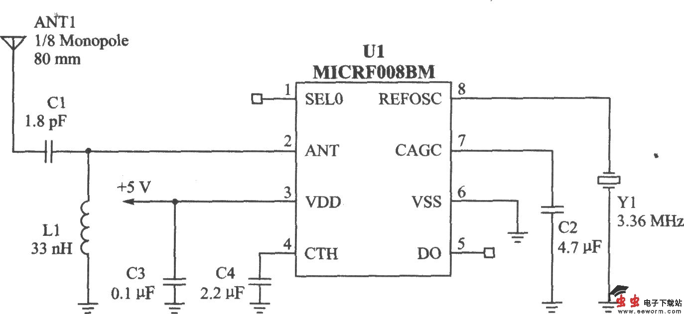 MICRF008是采用了Micre!公司最先进的QwikRadioTM技术的接收器芯片。片内的本地振荡器扫描速率大于基带数据速率,从而加宽了接收器的射频带宽,等效于超再生式接收器,使得MICRF008可与廉价的LC发射器配套使用,其外围元件少且成本低.MICRF008适合在无键进入系统、安全监控系统、玩具、遥控风扇、灯具控制和车库门开启等产品中应用。 主要技术特点如下: ·工作频率为300~440 MHz; ·OOK解调方式; ·接收灵敏度为-95 dBm(433092 MHz); ·数据传输速率为4.8 Kb/s以上; ·工作电压为4.75~5.5 V; ·工作电流为l6 mA(433.92 MHz); ·在天线上的RF辐射非常小; ·RF和IF调谐都自动在芯片内完成; ·外围元器件少; ·提供CMOS标准接口; ·取代超再生式接收器。