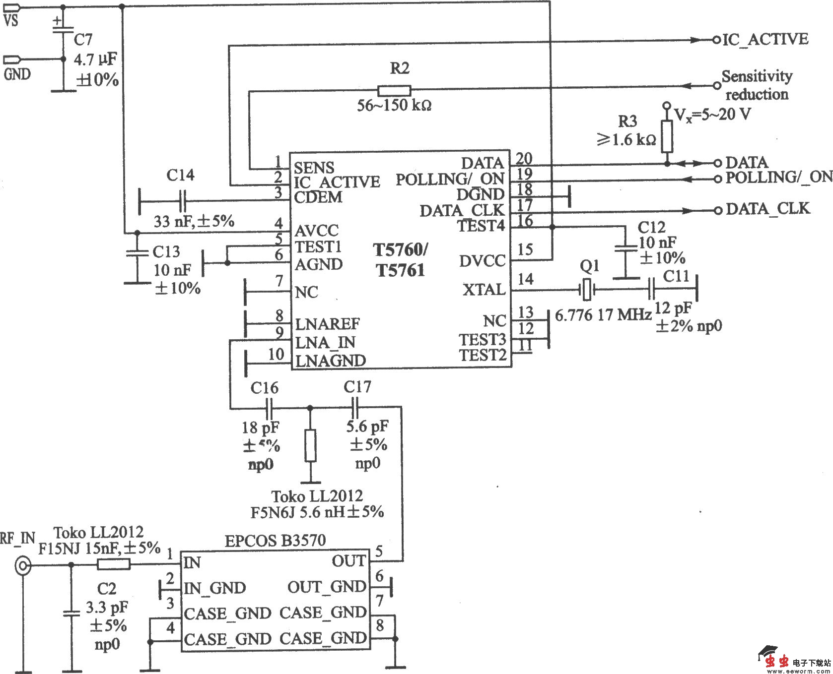 T5761/T5760在fRF =868.3 MHz带SAW滤波器的应用电路