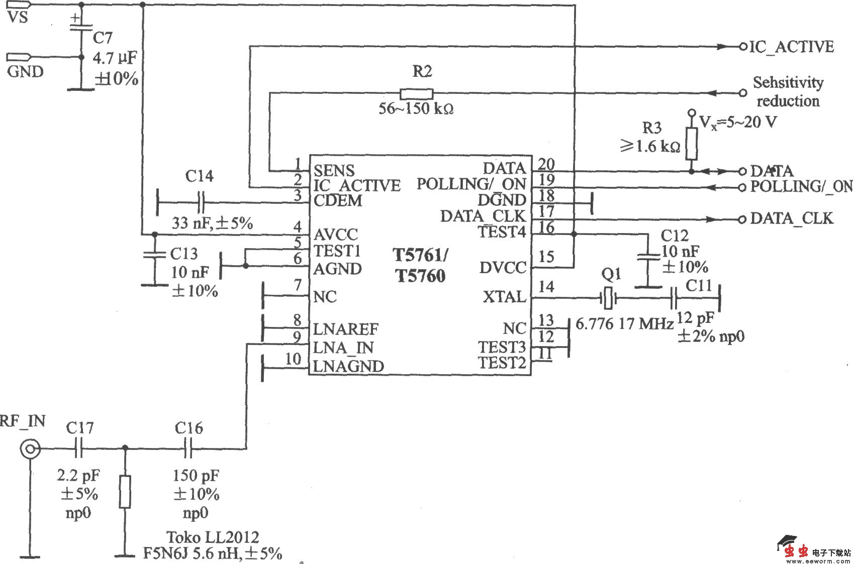 T5761/T5760是专为满足低成本RF数据传输系统的要求而开发的接收器。它与射频发射芯片T5750配套使用,适合在遥测、保安技术和无键进人系统等领域应用。 主要技术特点如下: ·接收频率为868~870 MHz/902~928 MHz; ·ASK/FSK解调方式; ·传输曼切斯特或双相位编码的数据速率为1~10 Kb/s; ·输入灵敏度:ASK方式为-ll0dBm,FSK方式为-l02 dBm ·系统IIP3为-l6 dBm,1 dB压缩点为-25 dBm,镜像衰减为30 dB; ·5~20 V兼容的数据接口,与微控制器通信只需要一根双工数据线; ·数据时钟可用于曼切斯特或双相位编码信号; ·有可编程的数字噪声抑制,可分配查询方式实现低功耗; ·最大额定电压为6 V; ·工作电流:FSK方式为9.9 mA, ASK方式为9.6 mA,睡眠方式为276μA; ·工作温度为-40~105℃。