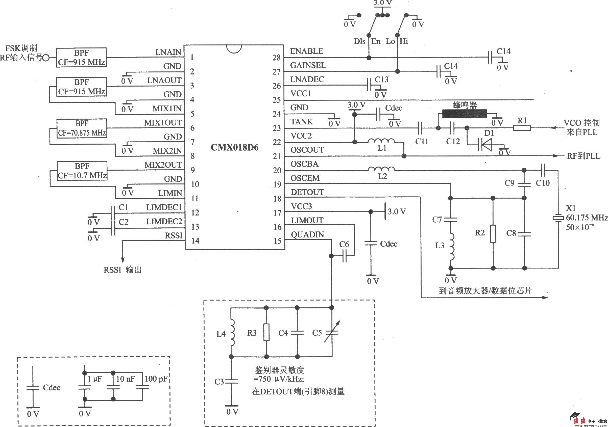 CMX018是双变换超外差接收器,与CMX017无线发射芯片配套使用,适用于ISM(工业、科学和医学)频率范围内的各种应用。 主要技术特点如下: ·工作在860~965 MHz UHF频段; ·FM/FSK解调方式; ·数据传输速率可达500 Kb/s; ·工作电压为2.7~3.3 V, ·工作电流为50 mA,低功耗模式电流低于l0μA。 ·工作温度为-10~ 60℃。