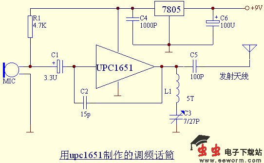 电路如图.本电路采用日本NEC公司生产的upc1651集成电路作为主要器件,该电路增益高,工作稳定,从而保证了话筒的高性能。用它组成调频发射电路.它用40--50cm软拖线作天线,有效发射距离大于30M. 仔细调整L间距和微调电容,可使发射频率覆盖范围为88--108MHZ.图中L用直径0.51mm漆包线在 直径4mm圆柱上绕5圈脱胎而成.