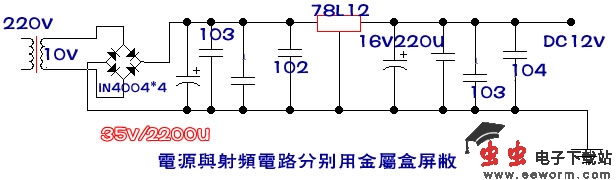 电路原理现见附图。图(1) 为电源部分,将市电降压整流后再加以稳压,获得稳定的12V直流电供射频电路使用。射频电路由高频振荡器、缓冲放大器、末级功率放大器及天线组成。高频振荡器用来产生载频信号,频点落在88--108MHZ内,并完成频率感量即可改变发射频率。射频信号由VT1的发射极输出,送到VT2、L2、C22、R4等组成的缓冲放大器进行功率提升,并可减轻末级放大电路对振荡器的影响。末级为高频率丙窄带放大,对射频功率再进一步放大,经C25耦合到发射天线向周围空间辐射。所驳接的音源若输出信号幅度过大时,需串入衰弱电阻,以免声音失真。