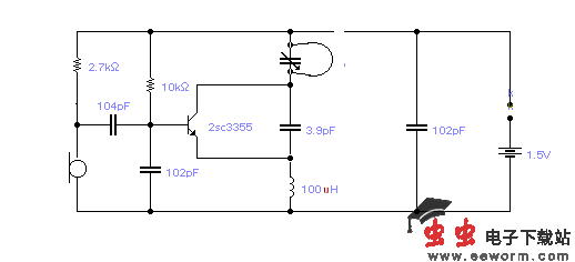 内藏式环形天线采用长度160MM,φ1MM 的漆包线制成金属圆环或方框形嵌入机壳内。调节电容C3,使发射频率落入88-108MHZ之间,以便用调频收音机接收。当电池电压在1。2-2V之间变化时,长时间工作。本电路发射频率稳定不变。电池电压1。5V时,整机工作电流约2。5MA。调试时,手不要靠近环形天线,安放时不要靠近金属物,以免影响振荡频率和发射距离。