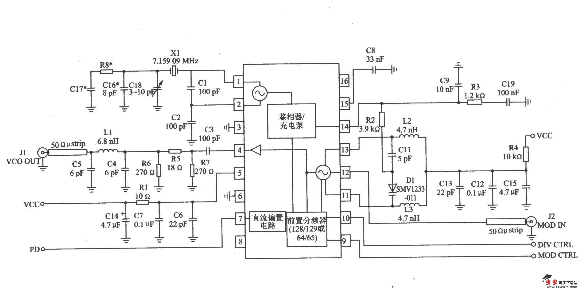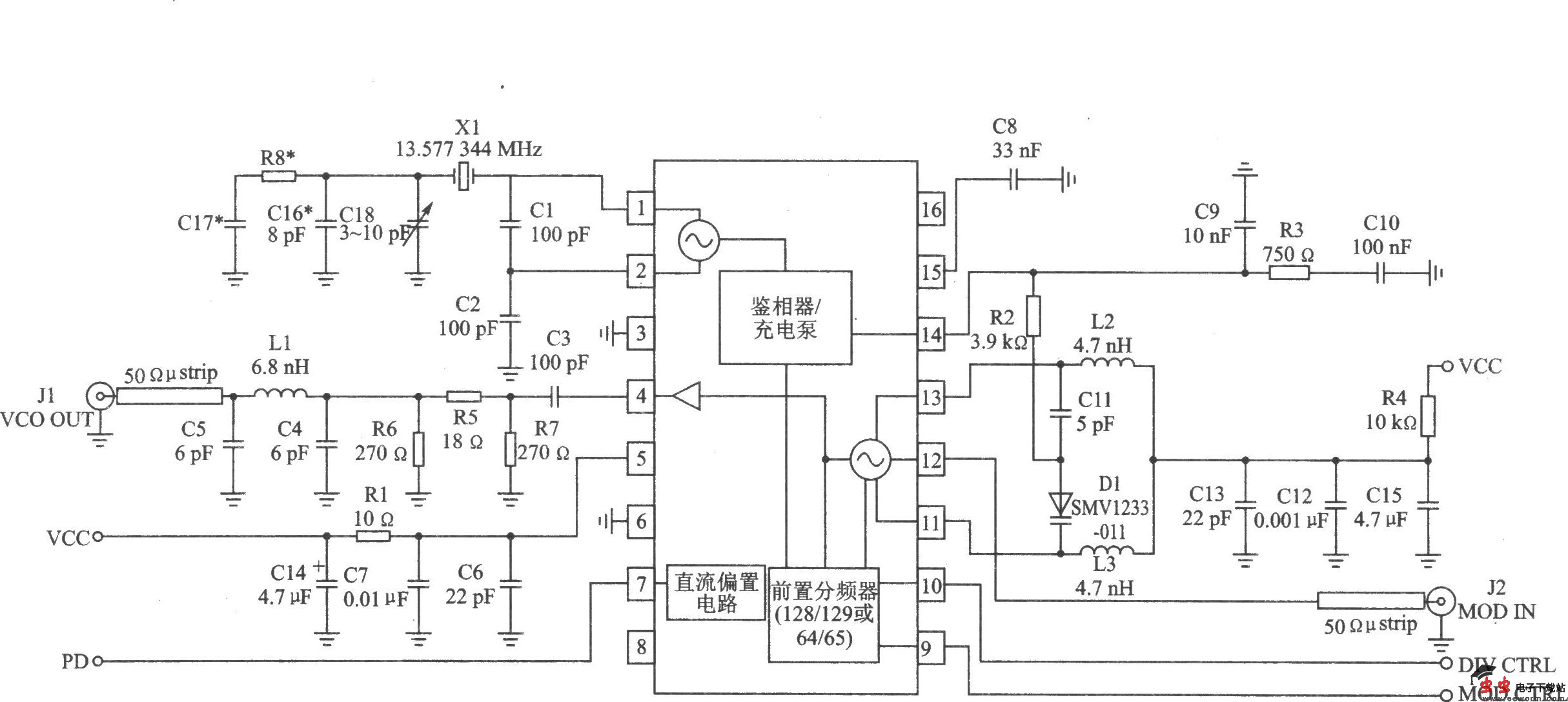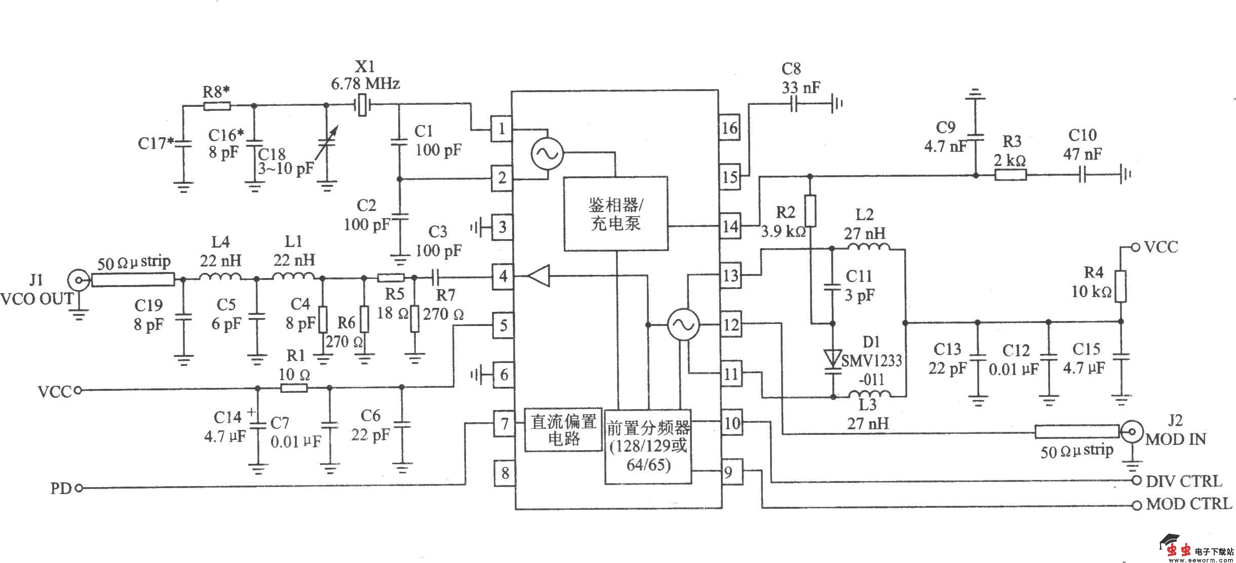 RF2510是一个使用低成本频率合成器、带有锁相环的发射芯片。它适合美国915 MHz ISM频段和欧洲433 MHz、868 MHz ISM频段中应用。 主要技术特点如下: ·工作频带为300~1000 MHz; ·FM/FSK调制方式; ·电源电压为2.4~5 V; ·工作电流为7~13.5 mA,睡眠模式电流为1 uA; ·输出功率为-2.5 dBm(50Ω负载)。