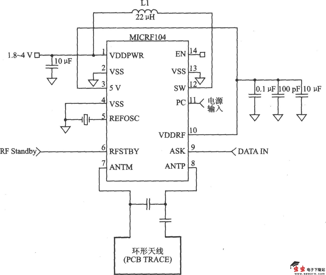 MICRFl04采用了Micrel公司最新的QwikRadioTM技术,是一个真正的“数据输入一无线输出”的低电压发射器芯片。它与该公司生产的QwikRadioTM系列接收器配合使用,适合自动遥控无钥匙进入系统(RKE)、遥控风扇/灯具控制系统、车门开启发射器、遥测传感器数据传输和安防系统中应用。 主要技术特点如下: ·工作频率为300~470 MHz; ·ASK/OoK调制; ·数据传输速率为20 Kb/s; ·天线自动调谐; ·电源电压为4.5~5.5 V; ·最大工作电流为35 mA,待机电流为l.5 mA;