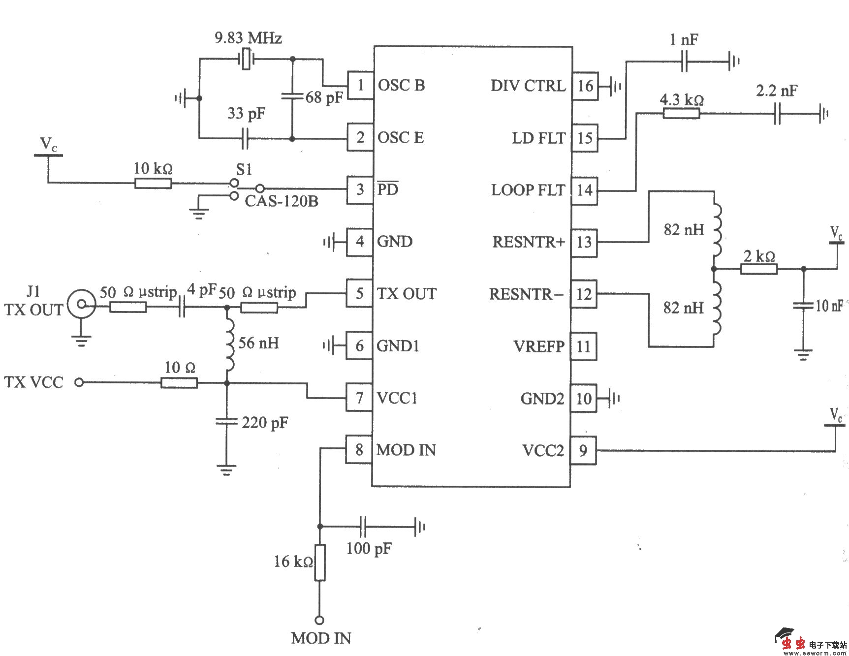 RF2516是一款带有锁相环的低成本发射器芯片。 主要技术特点如下: ·工作频率为l00~500 MHz: ·AM/ASK调制; ·有低功耗模式和自动闭锁功能,当PLL失锁时,发射器的输出无效; ·电源电压为2.25~3.6 V; ·输出功率为 10 dBm(50Ω负载); ·工作电流为l0.5 mA,低功耗模式电流为1μA