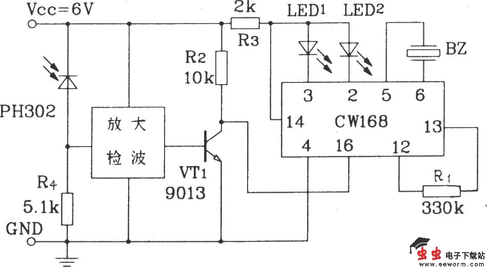 图中红外接收管接到红外发射器送来的38kHz的调制信号,经放大、检波后,送到VT1基极,VT1饱合导通,CW168被触发工作。此电路同样可实现单次、连续工作方式及音凋选择。